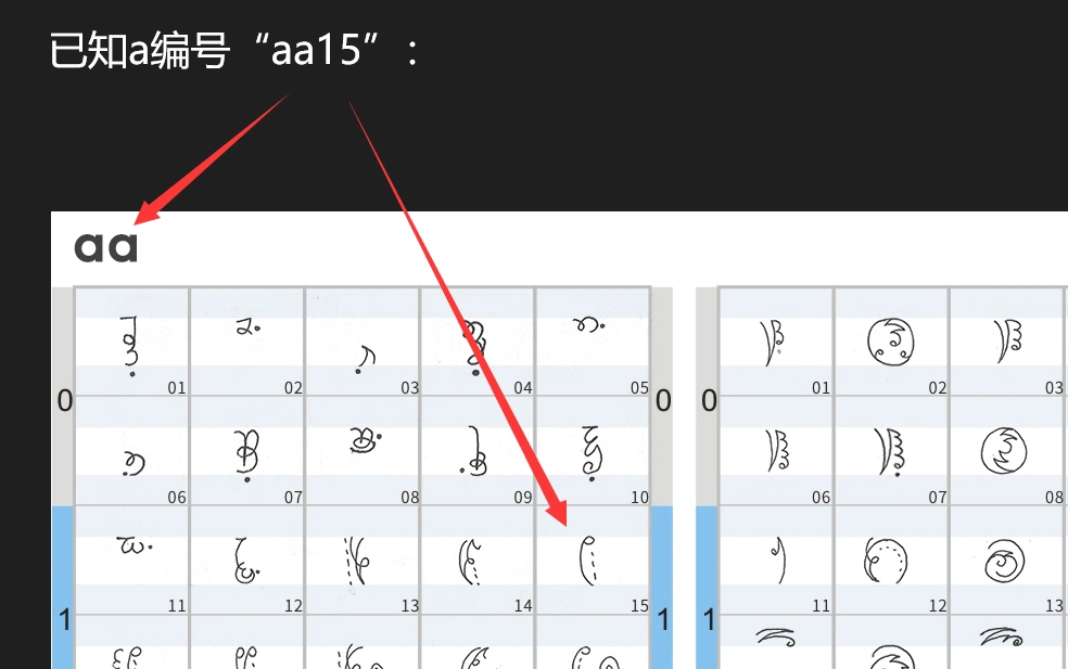 每一个蓝地语素文字编号都具有“xxnn”的格式,其中“xx”是页编号,两位分别按拉丁字母顺序(不含u;第一位不含b、d、f、g、h、k、l、m、n、t、z)进行排列;“nn”是数字编号,最小是01,最大是50。